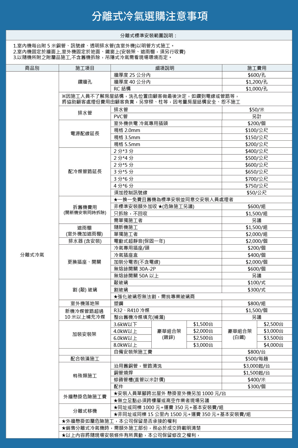*埋設暗管、鑿牆孔等恐危及建物安全結構之工事,安裝人員恕不處理,如要求冷氣安裝人員處理,若因此損壞房屋結構或管線安裝人員及本公司恕不負責。
