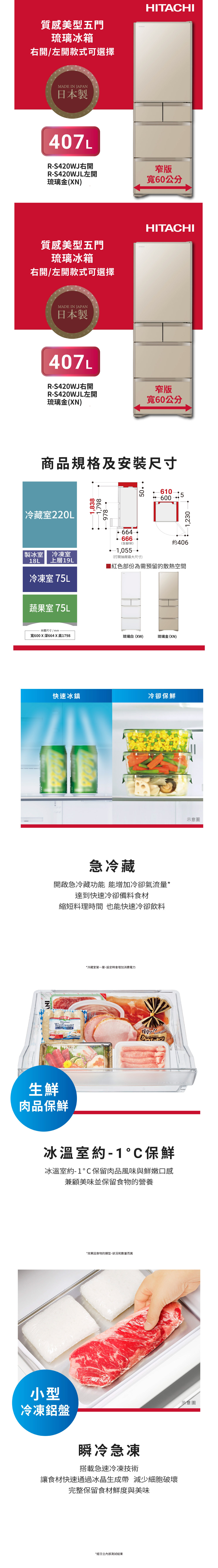 HITACHI日立 407L一級能效日製五門左開冰箱 琉璃金(RS420WJL-XN)