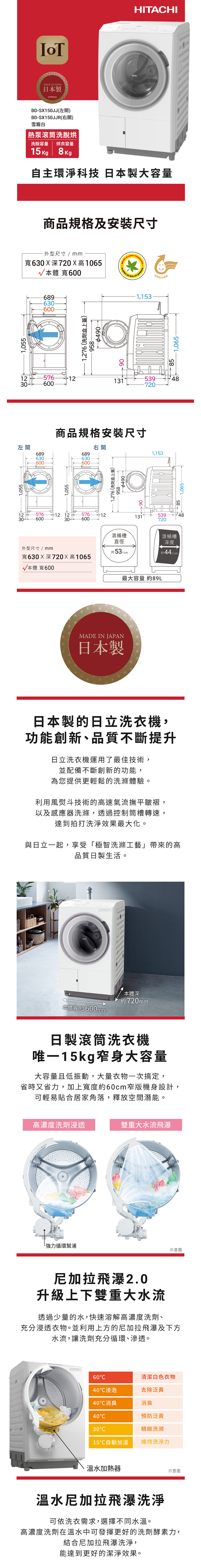HITACHI日立 15KG 日製AI智能感測變頻左開熱泵滾筒洗脫烘洗衣機(BDSX150JJ-W)