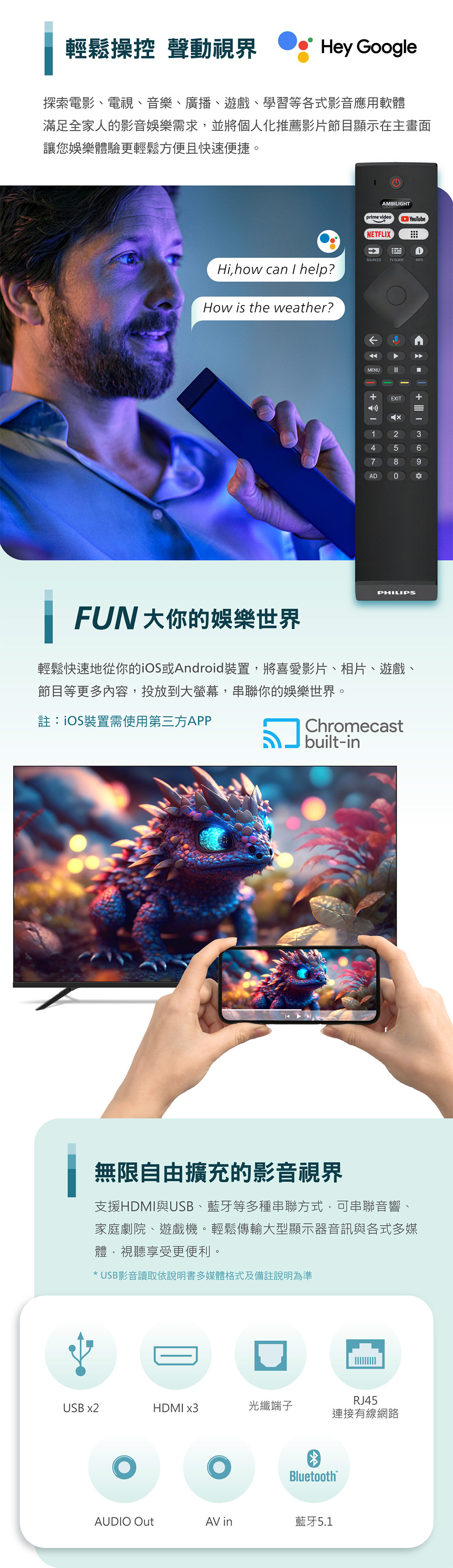 Philips 飛利浦 50型4K Google TV 智慧顯示器 50PUH7139