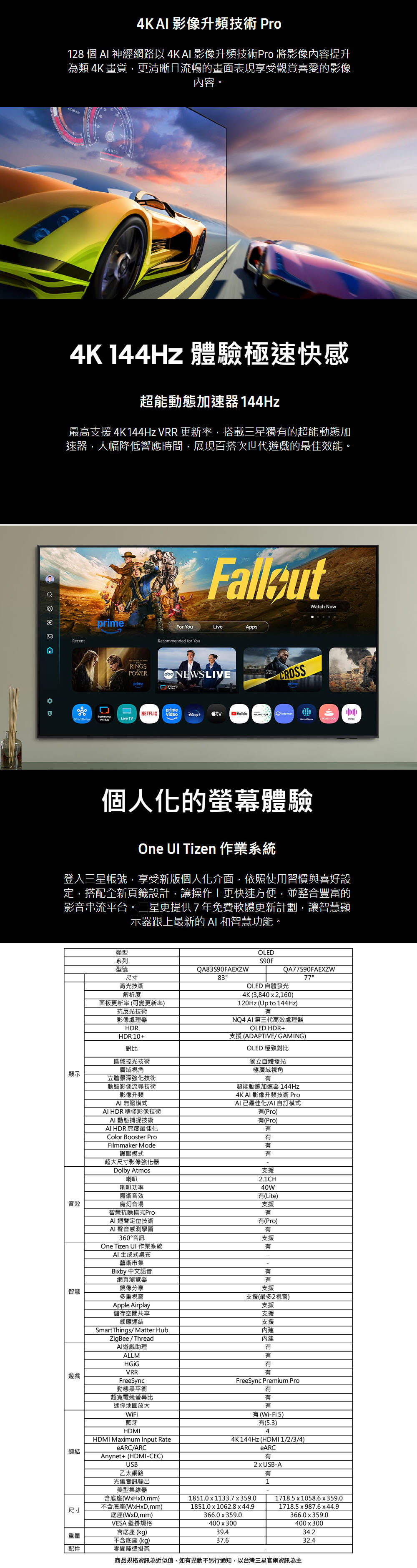 SAMSUNG三星 65型 4K 144Hz OLED AI智慧顯示器 (QA65S90FAXXZW)