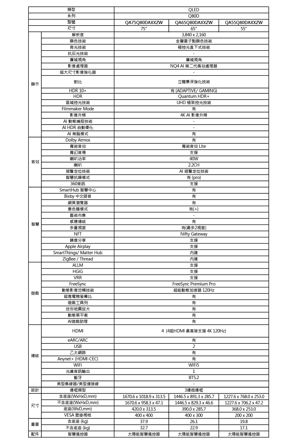 SAMSUNG三星 75型4K QLED 120Hz 智慧連網液晶顯示器 (QA75Q80DAXXZW)