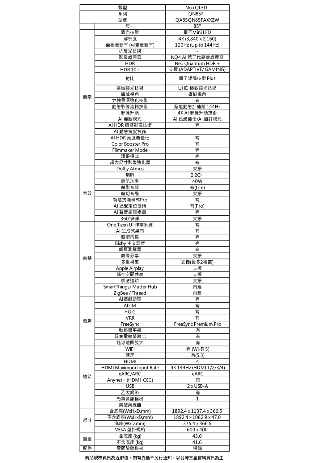 SAMSUNG三星 85型 4K Neo QLED 144Hz Mini LED AI智慧顯示器 (QA85QN85FAXXZW)