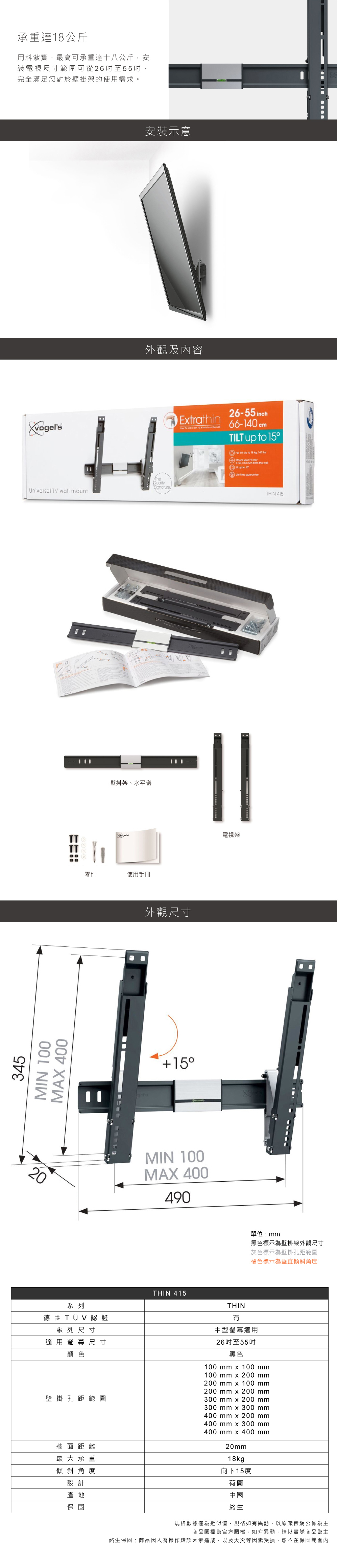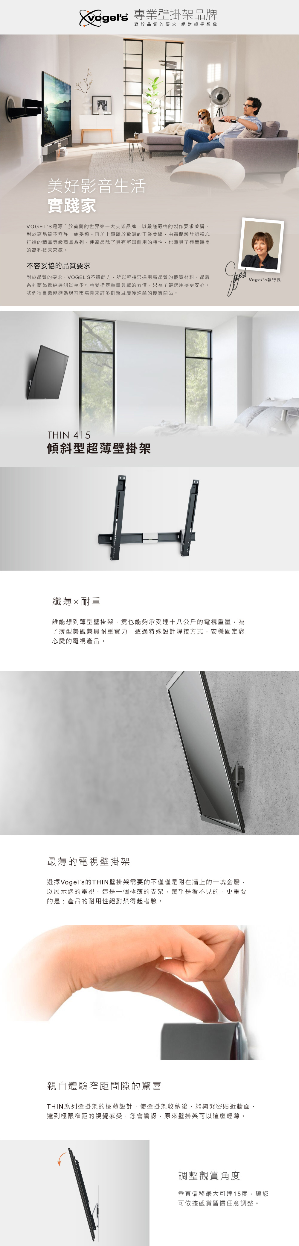 Vogel’s 荷蘭進口品牌 26-55吋 超薄型可傾斜固定式壁掛架 THIN 415