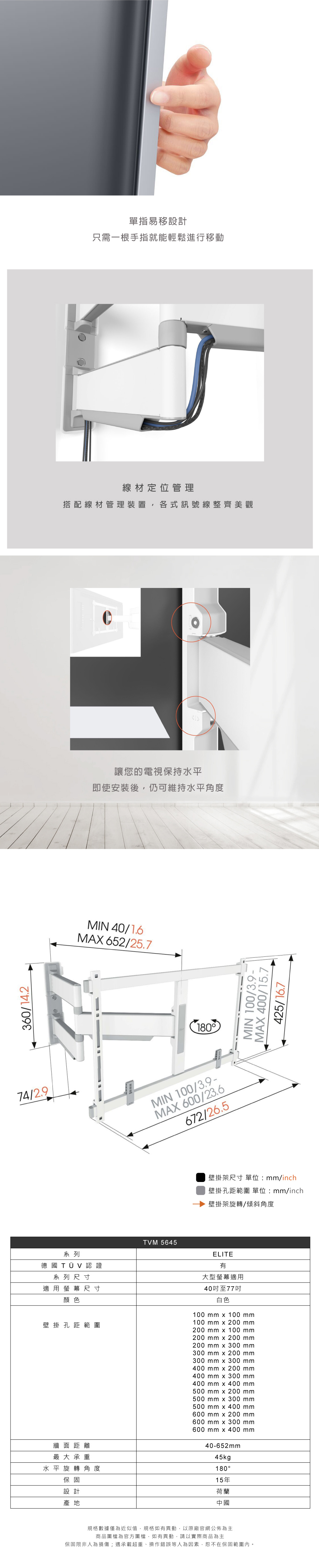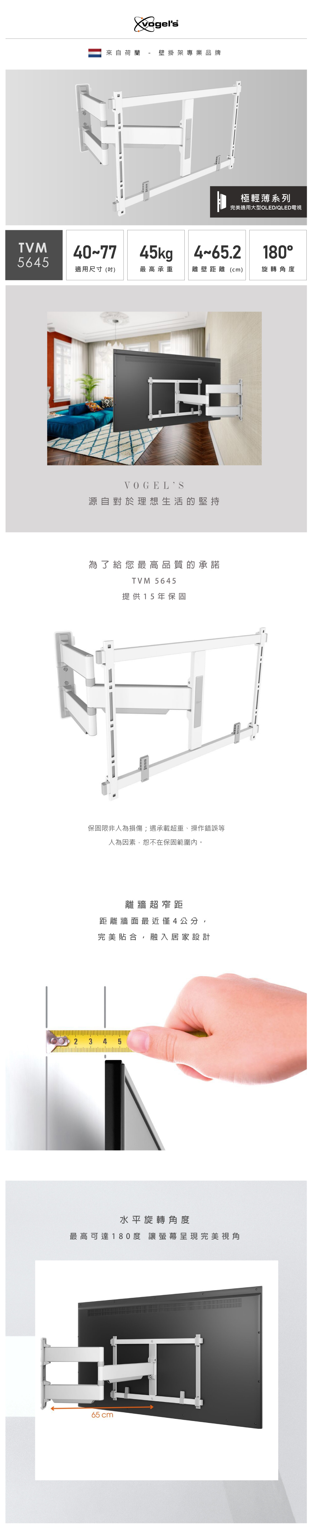 Vogel’s 荷蘭進口品牌 40-77吋適用 單臂式伸縮壁掛架OLED QLED適用款 白色 TVM5645-W