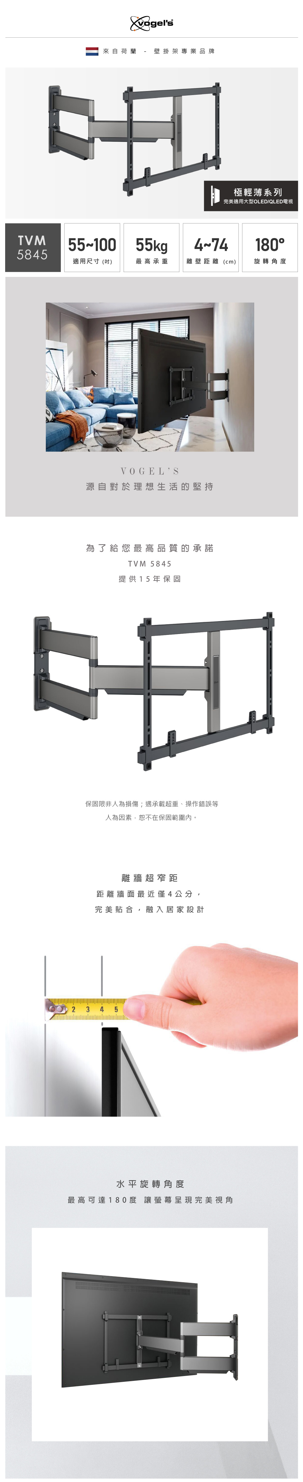 Vogel’s 荷蘭進口品牌 55-100吋適用 單臂式伸縮壁掛架OLED QLED適用款 TVM 5845