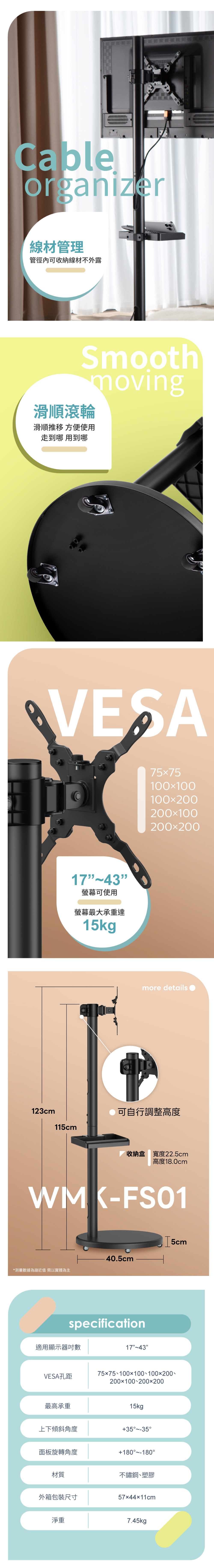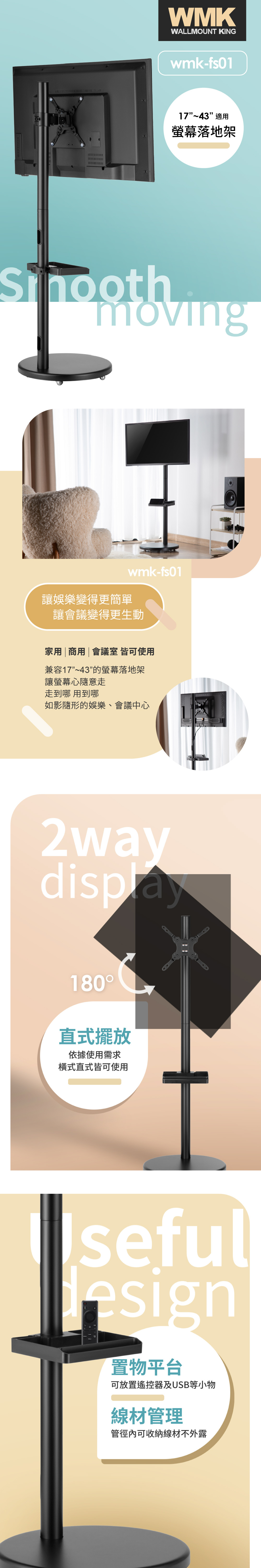 WMK 壁掛王 17-43型螢幕適用落地移動架 WMK-FS01